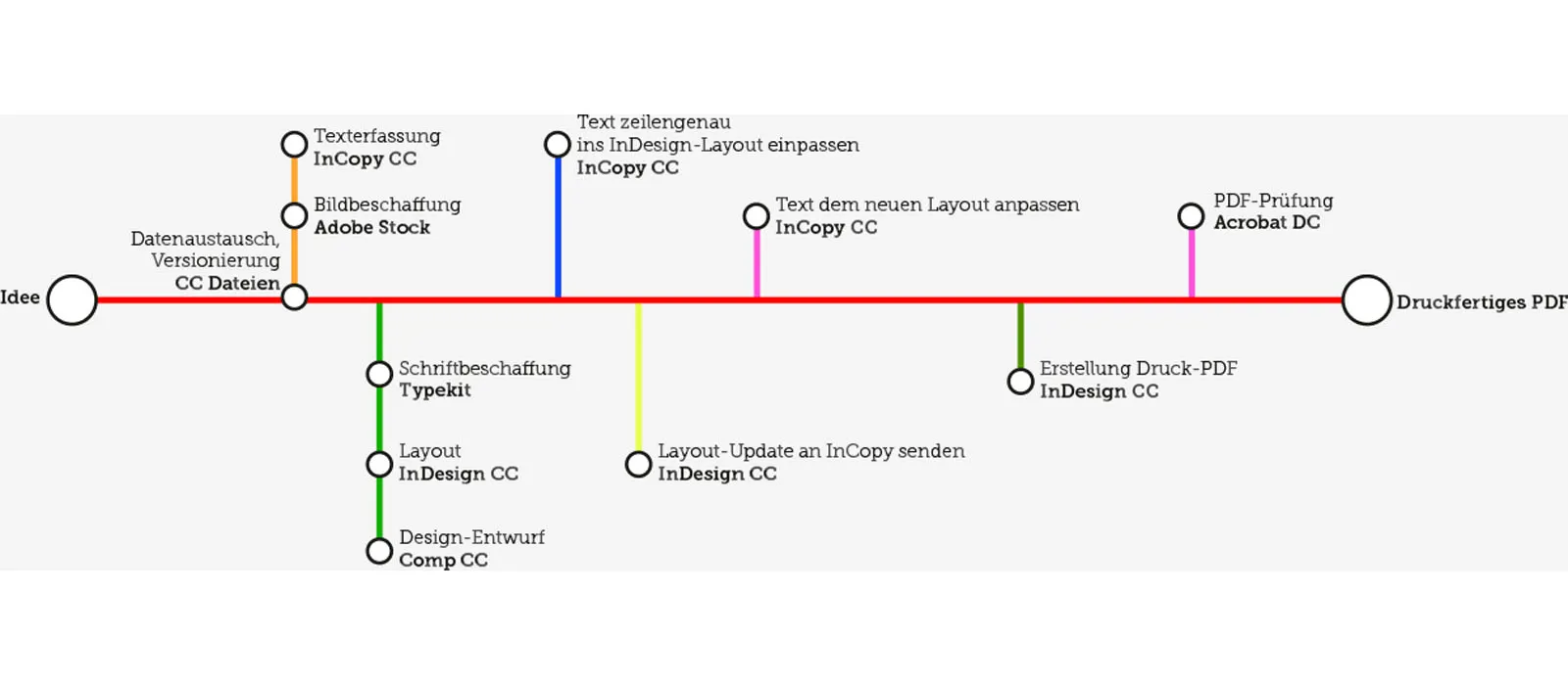 Im Redaktionsworkflow gibt es zwei grundsätzliche Arbeitsweisen: „Layout-vor-Text“ und „Text-vor-Layout“. Mit InCopy CC und InDesign CC sind beide Ansätze möglich. Das gängigste Vorgehen ist „Layout-vor-Text“. Hier erstellen Layouter mit InDesign CC die Seiten und verwenden Platzhalterrahmen für Texte und Bilder und weisen diese als „Aufgaben“ den Redakteuren zu. Für jedes InDesign CC-Dokument sind beliebig viele Aufgaben möglich. Diese können über einen zentralen Server oder über die Cloud verwaltet werden.